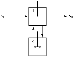 | is carried out in a nonideal CSTR with k = 0.03 min-1. The flow patterns seem to approximate two CSTRs with interchange (Figure CDE14-1.1). Species A enters the reactor at a rate of 25 dm3/min and a concentration of 0.02 mol/dm3 . The total reactor volume is 1000 dm3 . The results of a pulse tracer test are shown in Table CDE14-1.1 Using the results of these tests, determine the conversion. | ||||