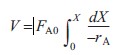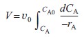 | For reactions in which the rate depends only on the concentration of one species [i.e., - rA = f(CA)], it is usually convenient to report -rA as a function of concentration rather than conversion. We can rewrite the design equation for a plug-flow reactor [Equation (R2.1-1)] in terms of the concentration, CA, rather than in terms of conversion for the special case when ν = ν0. | ||