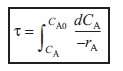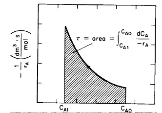 Equation (R2.1-5) is a form of the design equation for constant volumetric flow rate ν0 that may prove more useful in determining the space time or reactor volume for reaction rates that depend only on the concentration of one species. Figure R2.1-1 shows a typical curve of the reciprocal reaction rate as a function of concentration for an isothermal reaction carried out at constant volume. For reaction orders greater than zero, the rate decreases as concentration decreases. The area under the curve gives the space time necessary to reduce the concentration of A from CA0 to CA1. |