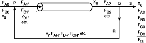 | The recycled stream is drawn off at point Q and merged with the fresh feed at Point P. We shall define the recycle parameter R as the moles recycled per mole of product removed at point Q. | |||