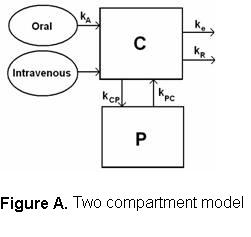 Many drug delivery studies use simplified lumping by considering only two compartments for intravenous injection of the drug and three compartments to include the stomach when the drug is taken orally. The two compartment model has a central compartment, C, consisting of blood and highly perfused organs such as the liver, kidney, lungs, etc., and also a peripheral compartment, P, consisting of the less perfused organs such as muscle and tissue.
