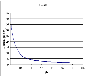 The drug 2-PAM is given as an antidote for the ingestion of herbicides and pesticides such as parathion. An aqueous solution 2-PAM is injected intravenously. We will use the two compartment model discussed above where 2-PAM is injected into the central compartment. Assume that the volume of body fluid accessible to exchange per kg of the body weight is 250 ml. The concentration of 2-PAM is shown as a function of time in the table below.