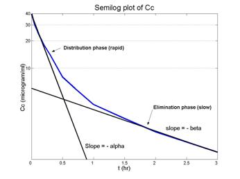A typical biexponential response curve is shown in Figure B for the drug in the central compartment.