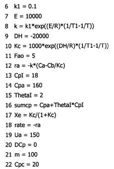 Equations (1) through (16) are the same as those in Example 12.4A. We now add Equation (17C) to replace Ta = 300 and also mf = 100 gmol/min and CPC = 20 cal/mol•K