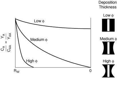 | The concentration profile along the radius of the wafer disk and the wafer shape are shown in Figure CDE12-9.2 for different values of the Thiele modulus. | |||