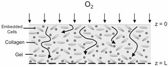 Here the patient’s own Cells are obtained from a biopsy and embedded in a hydro gel, which is a cross-linked polymer network that is swollen in water. In order for these cells to grow in place, once embedded, it is critical that the tissue engineer tune the respiration rate of the gel to match the rate at which the cells secret extracellular matrix molecules (e.g., collagen). Because there is no blood flow through the cartilage, oxygen transport to the cartilage cells are primarily by diffusion. Consequently, the design must be that the gel can maintain the necessary rates of diffusion of nutrients (e.g., O2) into the hydro gel. These rates of exchange in the gel depend on the geometry and the thickness of the gel. To illustrate the application of chemical reaction engineering principles to tissue engineering, we will examine the diffusion and consumption of one of the nutrients, oxygen.