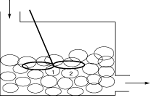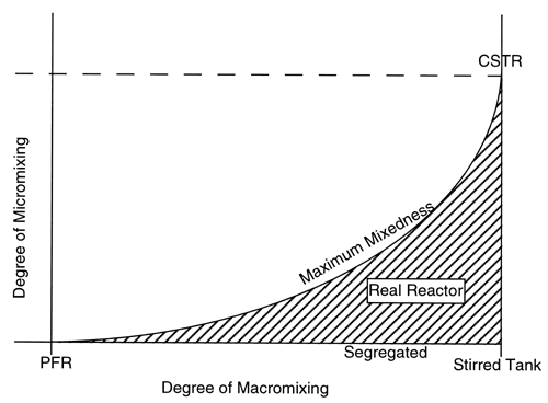 In the segregation model amd tje maximum mixedness model, one has to be able to perceive any macroelement of a fluid composed of numerous microelements. Macroelements have physical dimensions, but microelements don't have any physical dimension (like a point). When we consider mixing within a reactor with respect to the microelements present in the reactor, we can view two extreme levels of mixing. In one extreme, microelements are retained in a single macroelement. In other words, each macroelement is independent of another macroelement, and only the microelements within a macroelement mix with each other. This level of micromixing is called complete segregation. The other extreme level of micromixing is when microelements can permeate through the boundary of a macroelement. In other words, microelements from one macroelement can mix with microelements from another macroelement. In this type of mixing, all macroelements eventually loose their identity. This level is called maximum mixedness. Hence, we can see that in the segregation model, the different macroelements behave like batch reactors. In the maximum mixedness model, however, this is not the case because microelements of different macroelements can mix together. We have considered two extreme levels of micromixing. As we discussed in the text, there are also two extreme levels of macromixing. At one extreme, we have an ideal PFR that has no macromixing; at the other extreme, we have a stirred tank that has a maximum degree of macromixing. For a better understanding of mixing in a reactor, let us consider Figure R13.3-1. As can be seen, in a stirred tank, micromixing can take place at any level. In other words, a stirred tank allows us to have both segregation (the point on the x-axis) and also maximum mixedness (the uppermost point on the vertical line). This point corresponds to an ideal CSTR. In other words, an ideal CSTR is a stirred tank having the maximum level of micromixing (i.e. maximum mixedness). As also can be seen, an ideal PFR is a reactor where both micromixing and macromixing are absent. In other words, one microelement does not mix with any other microelement in the PFR. In between an ideal PFR and an ideal CSTR, we can have different kinds of real reactors that can show both segregation and maximum mixedness. The level of micromixing, however, will be highest for an ideal CSTR and will decrease as we approach an ideal PFR. R13.3.1 Segregation ModelFor the two microelements (say 1 and 2) flowing together in the reactor, which may or may not be macroscopically well mixed, the segregation model can be pictured as shown in Figure R13.3-2.Here, there is no exchange of reactants among macroelements, but there is complete mixing of microelements in each macroelement. Hence, each macroelement can be visualized as a well-mixed batch reactor. |
