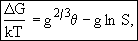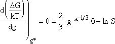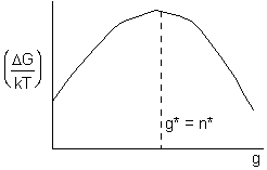 Figure 5. Dimensionless free energy as a function of cluster size g showing the variation of critical nucleus size n* with degree of supersaturation, (see Eqn. 12).
