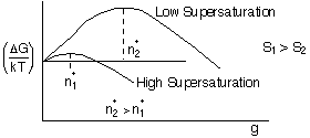 We note that the higher the supersaturation, S, the smaller the critical nucleus