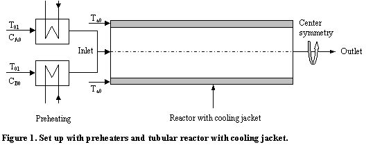 The time dependency will be shown as animations of the concentration of species A and the temperature modeled in COMSOL Multiphysics. As shown in Figure 1 the reactants are preheated separately and mixed before entering the reactor. When the start-up begins it takes some time before the preheaters get warmed up, so the inlet temperature of the reaction mixture will increase until it reaches the desired value, T0, which is 320 K. At t=0 there are only solvent in the reactor.