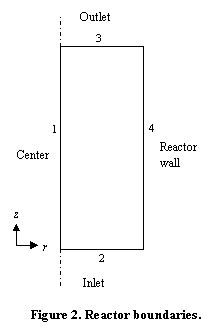 When the reactor is modeled in COMSOL Multiphysics it is assumed that the variations in angular direction around the central axis are negligible, and therefore the model can be axial-symmetric. The system is described by a set of differential equations on a 2D surface that represents a cross section of the tubular reactor in the z-r plane. That 2D surface's borders represent the inlet, the outlet, the reactor wall, and the center line. Due to rotational symmetry, the software needs only to solve these equations for half of the domain shown in Figure 2.