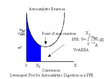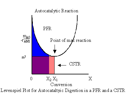 We see that if autocatalytic digestion takes place only in the stomach the most efficient system to convert food into products (as in vitamins and nutrients) is the CSTR. This difference in efficiency is easily seen when the performance of a CSTR and PFR are graphed against each other with the autocatalytic reaction. Ideally, in the digestive system a maximum reaction rate is desirable. Thus, conversion will be kept low and a CSTR will be desired. Physiologically this is also true because within a stomach upon exiting the feed is acidified which inhibits the fermentation process, and enzyme catalytized digestion begins to take place in the intestines.