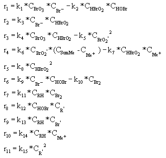 In the above scheme, BrO2', R', and Br' are free radical intermediates. RH is malonic acid and Me represents a metal ion. Notice that reactions #1 and 2, #4 and 5, #6 and 7, and #9 and 10 are essentially the same reaction, with one case being the reverse of the other. Because of this, in writing the rates of reaction we can reduce the number from 15 to 11. These 11 rates are shown below, with respect to a single mole of reactant.