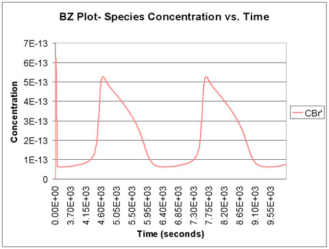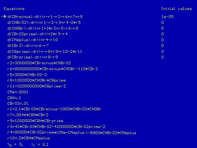 CBrO3 represents the stationary concentration of BrO3-, CRH represents the stationary concentration of RH, and CSumMe is the sum of the Me+ and Me++ concentrations. Putting the BZ scheme into Polymath with the appropriate rate constants, we get the following program.