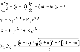 In this section we will carry out a linearized stability analysis of the reactions just discussed to determine the start and end time of the oscillations, the frequency, and the number of oscillations. Even though an abbreviated form of the BZ reaction is given on the web below, it is still relatively complex. Consequently to illustrate how oscillating reactions occur we shall use the following relatively simple reaction sequences. Consider the following elementary multiple reactions.