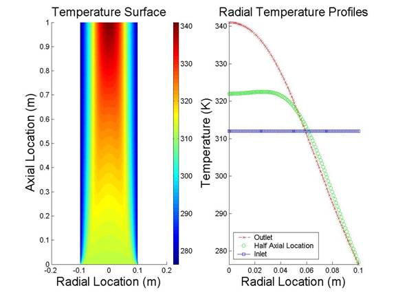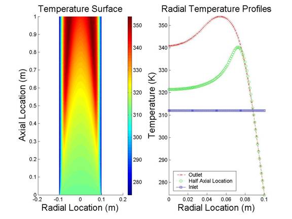 For the irreversible case we saw that a reaction mixture with a large value of the thermal conductivity constant displayed a lower maximum temperature and the decrease in temperature reached further into the center of the reactor. This is also true for a reversible reaction. However, in the plots below there is a difference between the reversible and the irreversible cases. Can you pick out the reversible cases?