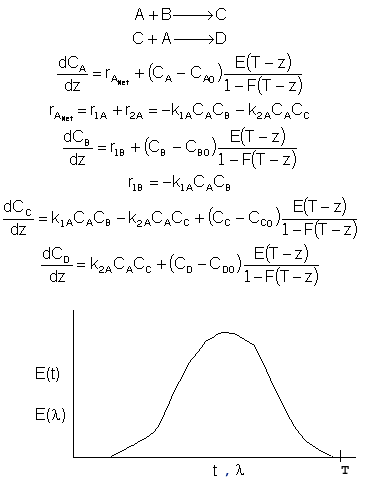 For multiple reactions use an ODE solver to couple the mole balance equations, dCi/dt=ri (where ri is the net rate of reaction), with the segregation model equations: dCi/dt=Ci(t)*E(t) as previously shown. For maximum mixedness: