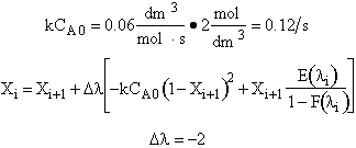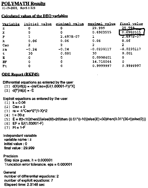 One notes a slight difference between the conversion predicted by the software solution (X = 0.69) and that predicted by the backward integration using the very approximate Euler method. We would have achieved closer agreement if we had chosen a small step size, especially at the beginning.