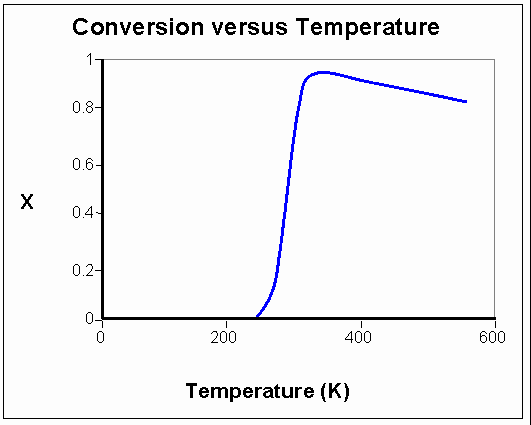 It is easier to establish our optimal conditions if we can see the effect of temperature on conversion (see the Conversion versus Temperature graph, below). At a constant pressure of 25 atm, we can see that our conversion reaches a maximum at a temperature of about 320 K. If we increase the temperature beyond 320 K, the rate of our unwanted reaction increases, and we see a drop in conversion.