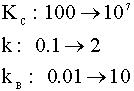 Using Polymath, determine the conversion of this system. Then, vary KC, k, and kB as follows: