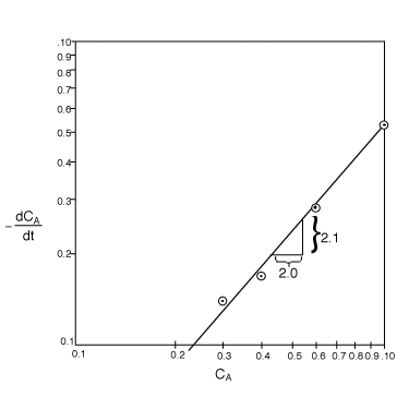 versus CA on log-log paper to determine the reaction order. The correct plot on log-log is as follows.