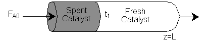 Initially the reactor is filled with inert gas and at time t = 0 the reactant gas mixture is fed to the reactor. At the start, the reactant gas sees only fresh catalyst and methane is produced. As time goes on the catalyst at front of the reactor becomes spent as a result of being poisoned by CO and the entering reactant gas must travel further down the reactor to reach fresh catalyst.
