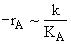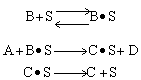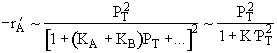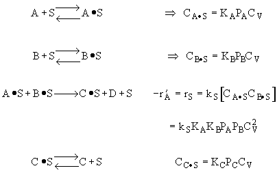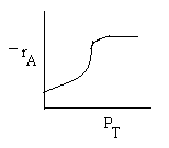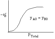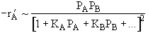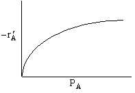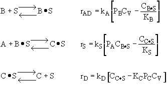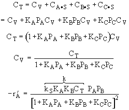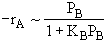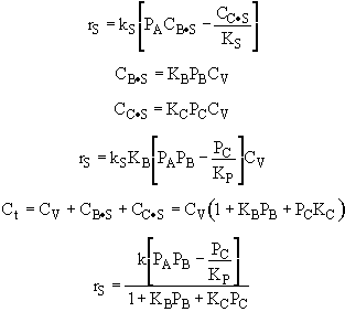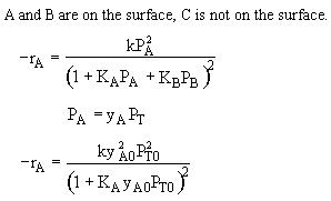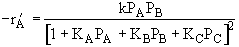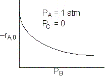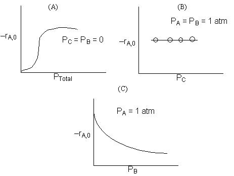 A is not on the surface or if it is KAPA << 1. B is on the surface and we see as we increase PB, the rate reaches a plateau. The curves from A, B, and C partial pressure suggest a rate law of the for |
