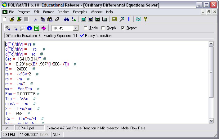The screen should now look like the picture below. You can Double click on the equations to change them or their initial values. When you are ready to solve the problem, click on the right arrow button. You can change the solution output by clicking on the "Table" or "Graph" check marks.