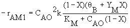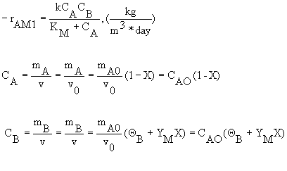 Where, v0 is the entering volumetric flow rate (m3/kg), mAO is the entering mass flow rate (kg/day), CAO is the entering concentration of hippo feed in (kg/m3), ΘB is the ratio of microbes to hippo feed, YM is the yield coefficient (dimensionless) and KM is the Monod constant (kg/m3). Substituting for the concentrations CA and CB: