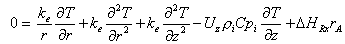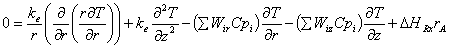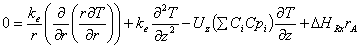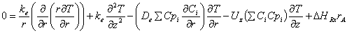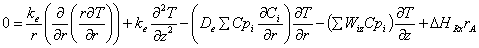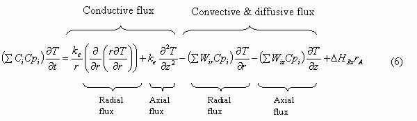 Similar to the Eqn (1) for the mass balance, the term on the left hand side represents accumulation of energy. The first and the second term on the right hand side represents the conductive fluxes in the radial and axial directions respectively. The two following terms represents heat flux generated by a flux in mass. This flux consists as always of two parts; Flux by diffusion and convection. The last term represents the heat production through the heat of reaction. So, a difference in energy flux over a volume element is either due to accumulation of heat or the production or consumption of it.