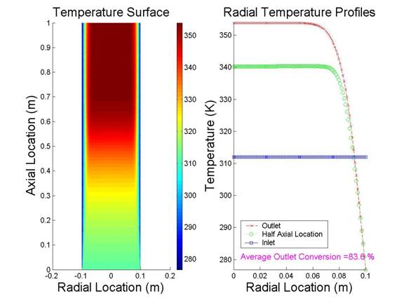 The Temperature Surface plot and the Radial Temperature Profiles clearly show the effects of the added cooling jacket. The temperature still increases throughout the center of the reactor whereas the temperature drastically drops close to the reactor wall.