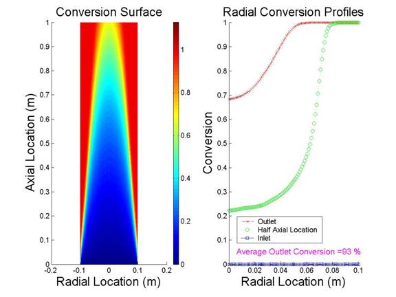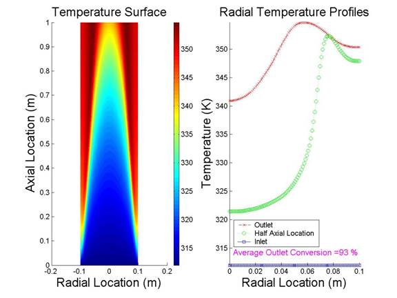 Observing the graphs we see that the maximum temperature is found somewhere between the center and the wall and that the location of the maximum point gets closer to the center throughout the reactor. Try to explain this behavior.