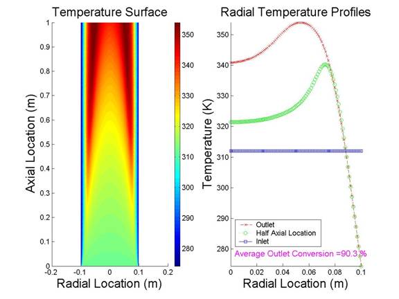 Also, it is clear that the maximum temperature of the half axial location is lower for the case with the cooling jacket than without. The temperature in the center of the reactor is not affected and no significant change is seen in the maximum outlet temperature. This is due to the fact that the cooling jacket has more effect the closer to the wall you are. The half axial maximum location is situated closer to the wall than the outlet maximum, and therefore is more affected. However, even though the maximum outlet temperature is not affected, a smaller portion of the exiting flow reaches the maximum temperature and the overall outlet temperature is definitely lower for the case with a cooling jacket.