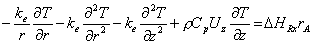 We have already added a cooling jacket to a plug flow reactor, now let’s do it for the laminar flow. The mass and energy balance for this problem are the same as for the previously problem. The only thing that changes is the boundary condition for the energy flux at the wall boundary. There is a net energy flux leaving the reactor due to the cooling jacket. The boundary condition is simply set to the energy flux.