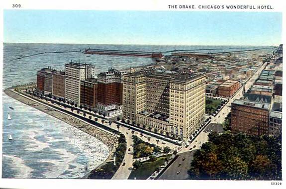 Construction on The Drake began in 1920 by the self-taught, novice architect Ben Marshall, who was known for his Italian Renaissance style. It was he who decided in 1917 that the area where The Drake is now located, would be Chicago 's most prominent area, and should therefore be the site for The Drake. In order to do so, Ben Marshall persuaded hotelmen John and Tracy Drake to construct this luxury hotel. They did this on reclaimed land from an area previously occupied by Lake Michigan . Marshall 's Italian Renaissance style reflects the formal composition and detail of the Italian palaces of Renaissance Rome and Florence . The land, construction and furnishings for The Drake led a total construction cost of $10,000,000. (5)