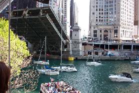 Boats traveling on the Chicago River beneath the Michigan Avenue bridge.