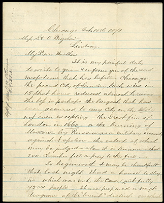 "It is my painful duty to write to you and inform you of the sad misfortune that has befallen Chicago. The proud city of Sunday last was in 15 short hours reduced almost to ruins."