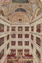 With Chicago growing rapidly, Field realized he must do the same. The store's first expansion took place in 1893 with the opening of a nine-story structure on the corner of Washington and Wabash, which dealt with thousands of foreigners during the World's Columbian Exposition. The desire to expand even further prompted Field to acquire all properties bounded by State, Washington, Wabash, and Randolph. From 1900 to 1907, Field effectively demolished every building on the city block, except the 1983 store, and replaced them with retail buildings, each housing upwards of seven floors. (11) The new store was designed in a neo-classical style, similar to that of most banks and municipal buildings. Such a style suggested to patrons the store's established and trusted understanding of cultural tastes. The State Street location remains in its original neo-classical form to this day. The reconstruction of 1907 also required the demolition of the 1879 location at the corner of Washington and State. The structure replacing the site was also in a neo-classical style, and consisted of a five-story light court topped by a glass mosaic dome. (12) |