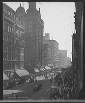 In 1852, Potter Palmer, one of Chicago 's most notable entrepreneurs, began a small dry-goods store on Lake Street, located in Chicago's top retail district. By implementing unique, strategic retail strategies, including return and credit policies, Palmer quickly made a name for himself. Facing health concerns, Palmer was forced to sell his business to two young merchant entrepreneurs, one being Marshall Field. Once out of the retail business, Palmer turned his focus to real estate development. Palmer hoped to one day transform State Street into a grand shopping district that would bring Chicago international recognition as one of the world's greatest cities. In 1868, Palmer constructed a magnificent structure on the northeast corner of Washington and State, and insisted Field relocate his recently acquired firm to the new State Street location. (9) In 1971, the Great Chicago Fire consumed central Chicago and left Marshall Field's store in ashes, along with thousands of dollars in merchandise. Despite the tremendous misfortune, Field insisted on reconstruction. With goods continuing to arrive daily, Field conducted business seemingly uninterrupted. A short while later, plans for the construction of an improved State Street store were unveiled. (10) |