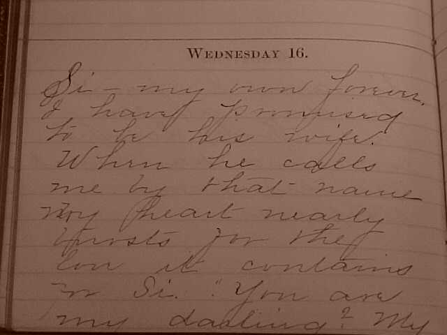 July 16, 1884 Wednesday Si, my man forever. I have promised to be his wife. When he calls me by that name my heart nearly burts for the love it contains for Si. You are my darling. |