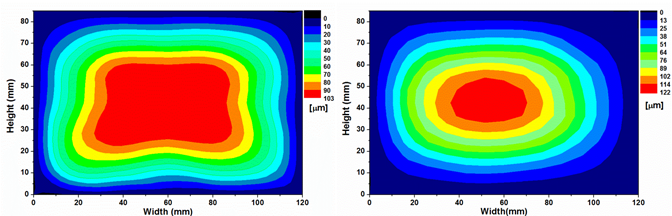 Swelling of prismatic Li-ion battery due to Li-ion intercalation (left), temperature elevation (right)