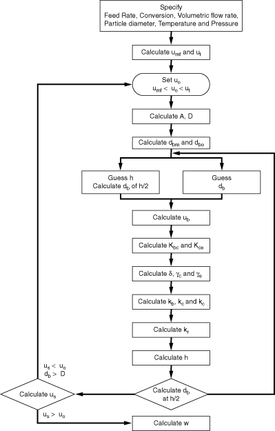 ProcedureUnfortunately, one must use an iterative procedure to calculate the catalyst weight. This predicament is a consequence of the fact that both K R and u b depend on the bubble diameter, which depends on the bed height, Equation (CD12-3.52). Consequently, one should check the estimated average bubble diameter using the value of h calculated from Equation (CD12-3.52). A flowchart outlining this procedure is shown in Figure CD12-3.8. However, either POLYMATH or MATLAB™ can be used to eliminate some of the assumptions used in arriving at Figure CD 12-3.8. Specifically, one could use the equation for bubble size as a function of height (i.e., Equation CD 12-3.15) directly in the equations for the transport coefficients (Equations CD 12-3.30 and CD 12-3.32) and them use an ODE solver rather than evaluating the bubble size at the midpoint in the column. One could also couple the unsteady state balances on the cloud and emulsion phases (Equations CD 12-3.34 and CD 12-3.35) to the mole balance on the bubble rather than neglecting the transient terms in these balances. |