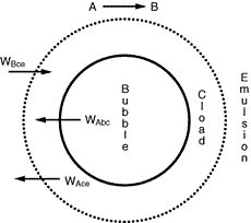 Where C Ab and C Ac are the concentration of A in the bubble and cloud, respectively (mol/dm 3 ), and W Abc represents the number of moles of A transferred from the bubble to the cloud per unit time per unit volume of bubble (mol/ dm 3 s). The concept of basing all mass transfer (and later, all reaction) on the bubble volume proves to simplify the calculations markedly. For the products (e.g., B in A B) the rate of transfer into the bubble from the cloud is given by a similar equation: |