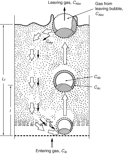 | where W Ace is the moles of A transferred from the cloud to the emulsion per unit time per unit volume of bubble. Note that even though this mass transfer does not involve the bubble directly, it is still based on the bubble volume. Using Higbie's penetration theory and his analogy for mass transfer from a bubble to a liquid, Kunii and Levenspiel 24 developed an equation for evaluating K ce : |