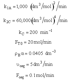 The complex gas phase reactions take place in a catalytic packed bed with C diffusing out the sides. The feed is equal molar in A and B with FA0 = 10 mol/min and the volumetric flow rate is 100 3/min. The reactor volume is 50 dm3 and the total entering concentration is CT0 = 0.2 mol/dm3. There is pressure drop and entering pressure is 100 atm and the rate constants are