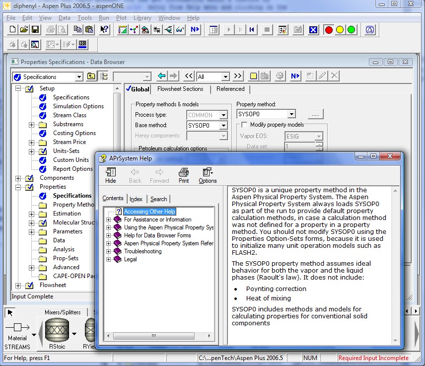 In this section the parameters for various component properties are set. As the pressure is low enough ideal conditions will be assumed. SYSOP0 is the property method in Aspen Plus™ that provides ideal behavior in liquid and vapor phases. You can get information about a feature by selecting the What's this? entry from Help menu and clicking on the feature you are interested in. Aspen help files are opened and the SYSOPO property method is explained.