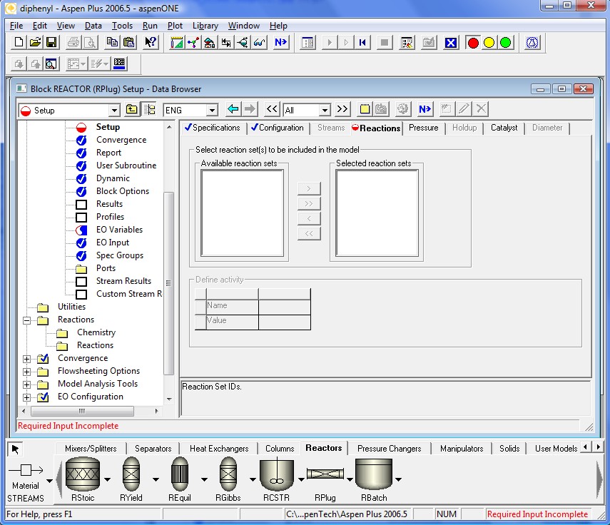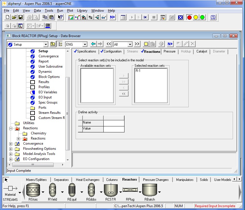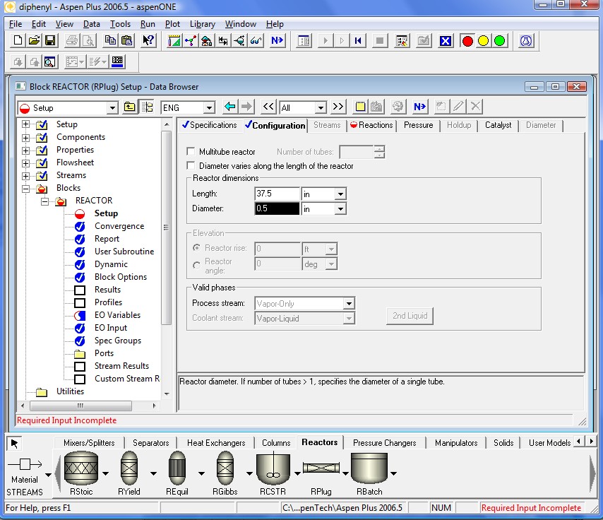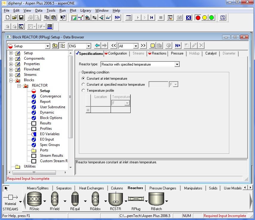 Now we will specify the reactor specifications. First, we assume isothermal operation at inlet conditions.