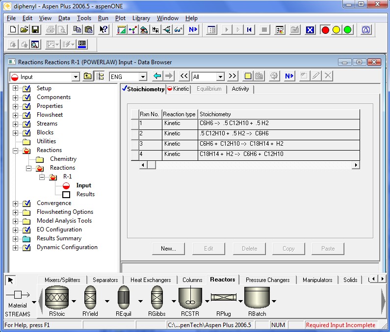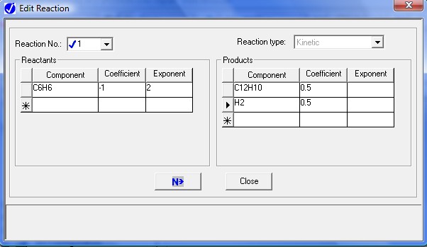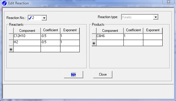 After completing the first reaction select New from Reaction No. list. Next picture will show the coefficients for the reversed part of the first reaction. In Aspen Plus™ notation, this will be our 2nd reaction
