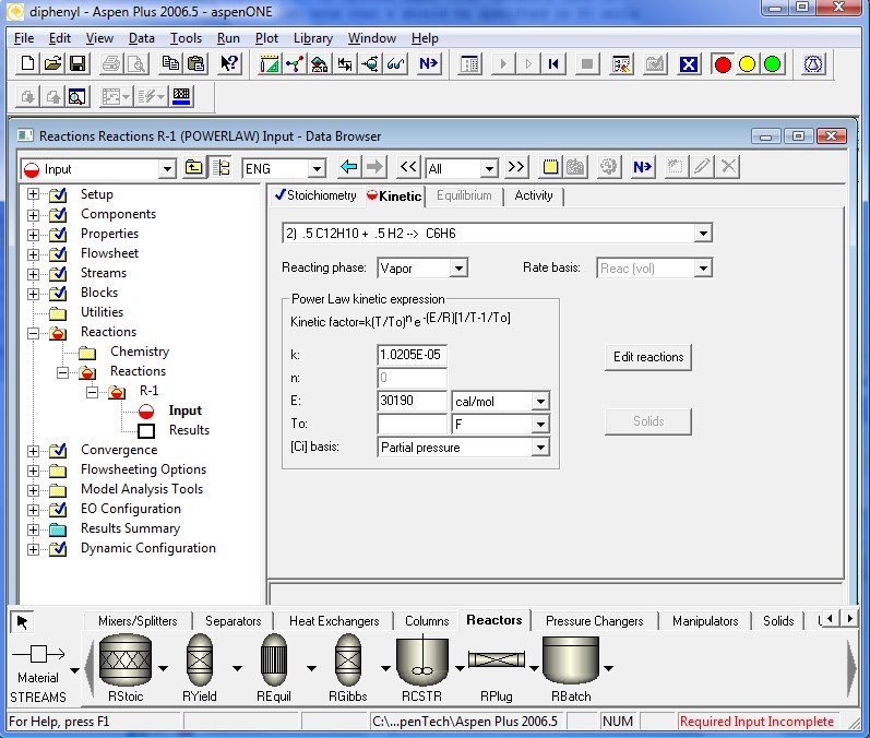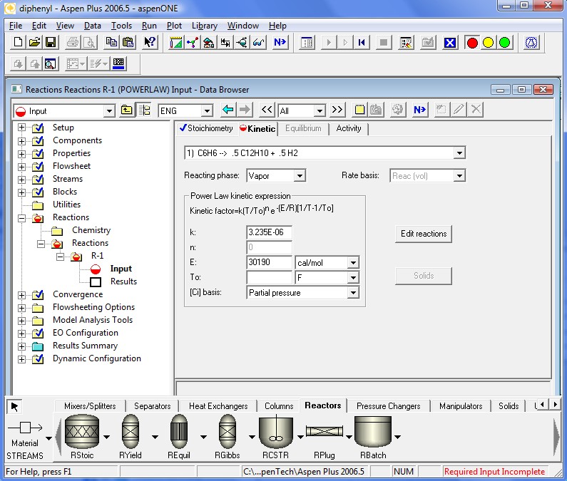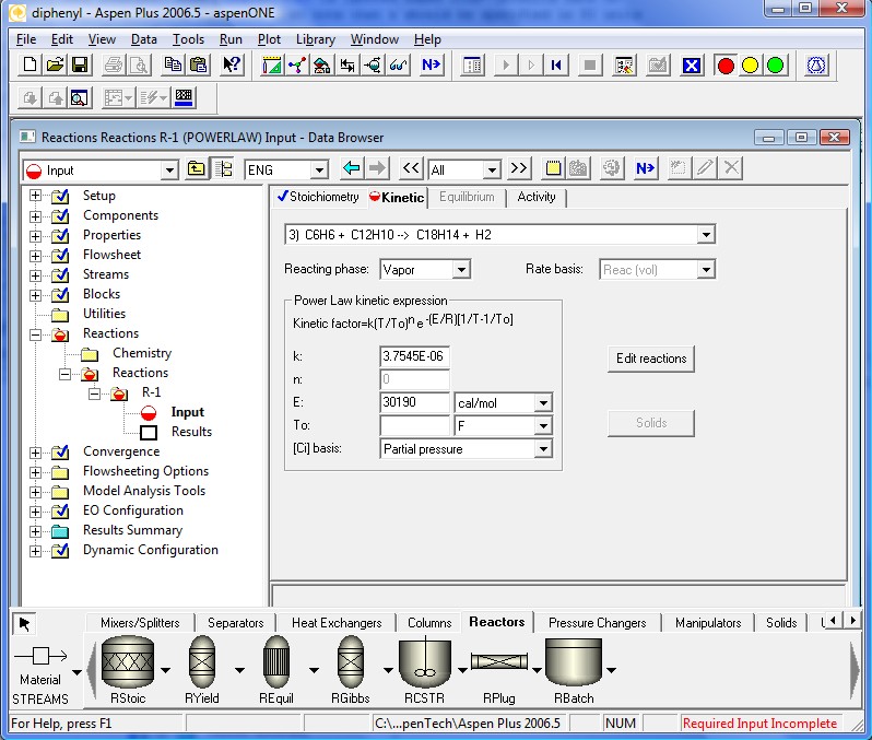 The kinetics coefficients are specified in the following four pages. Note that the definition of the kinetic factor expression is a little different. It is a more general definition for the specific reaction rate constant. When To is ignored Aspen Plus™ defaults back to simpler Arrhenius Equation. Also note that k should be specified in SI units regardless of the units used elsewhere.