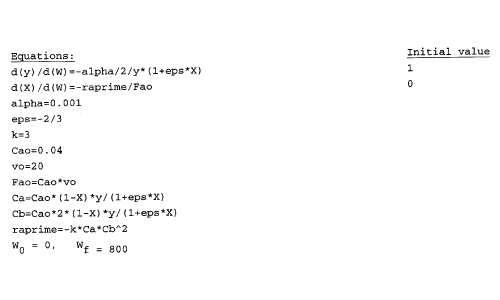 The elementary gas phase reaction A + 2B --> C is carried out in a packed bed reactor. Calculate the exit conversion from a PBR packed with 800 kg of catalyst. The feed is stoichiometric.